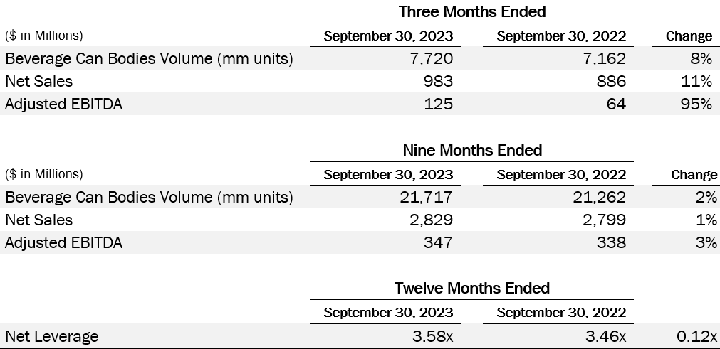 - During the three months ended September 30, 2023, beverage can body volumes increased by 8%, while during the nine months ended September 30, 2023, beverage can body volumes increased by 2% as compared to the corresponding periods in 2022. The positive volume development during the three months ended September 30, 2023 was mainly related to incremental U.S. volumes, which have driven 28% growth in the Americas combined with a 4% increase in volumes in Europe, partially offset by lower performance in Brazil and UAE. The 2% increase in beverage can body volumes during the nine months ended September 30, 2023 was mainly driven by positive performance in the Americas and Europe.